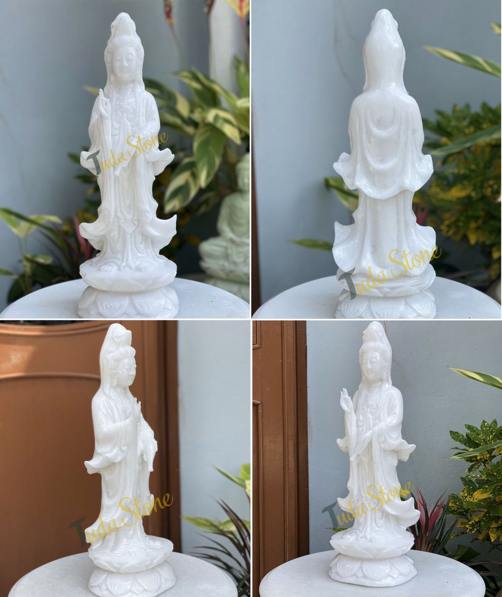 TƯỢNG PHẬT QUAN ÂM ĐỨNG BẰNG ĐÁ CẨM THẠCH TRẮNG - TUDA STONE được điêu khắc bằng đá tự nhiên và nguyên khối, có thể được điêu khắc trực tiếp bằng nhiều loại đá khác nhau tại Cơ sở Điêu khắc Đá mỹ nghệ TuDaStone, có trụ sở tại Làng đá Non Nước Ngũ Hành Sơn, Đà Nẵng